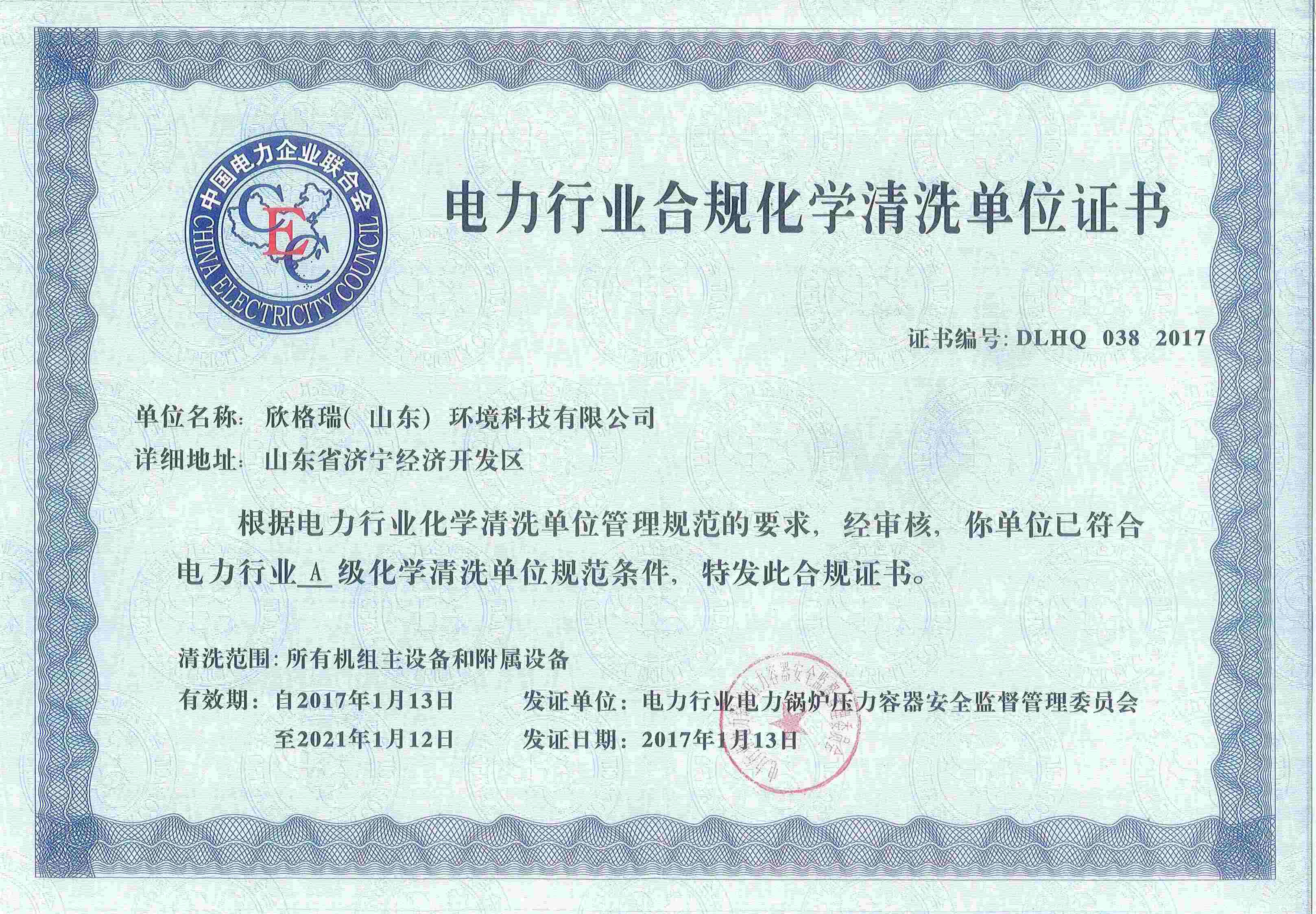 2017年01月,獲中電聯(lián)鍋監(jiān)委電力行業(yè)合規(guī)化學(xué)清洗A級(jí)資質(zhì)。