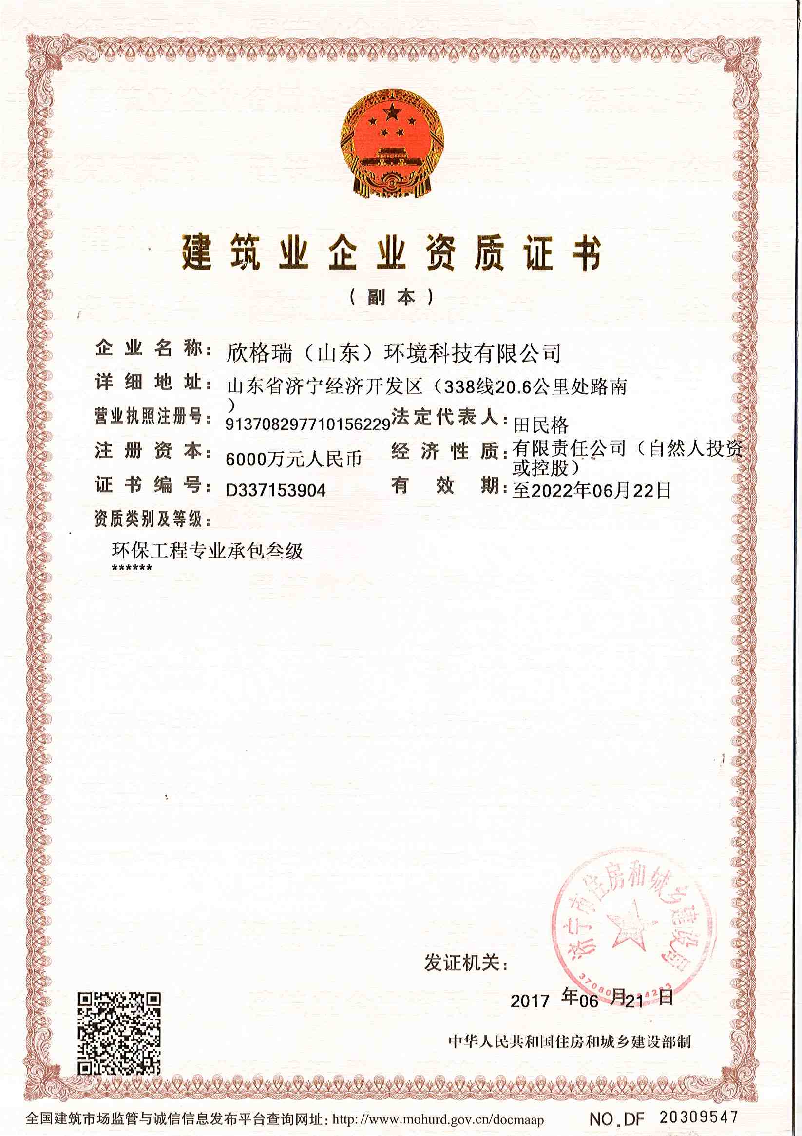 2017年06月,獲環(huán)保工程專業(yè)承包資質(zhì)。