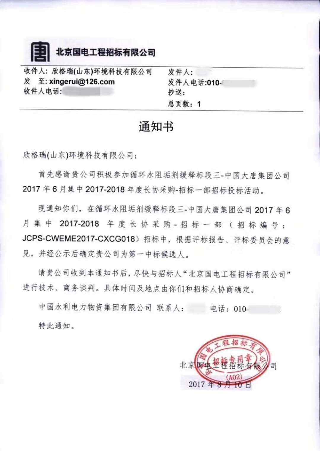 2017年07月,中標(biāo)大唐集團(tuán)全國(guó)三分之二共51家電廠的綠色環(huán)保循環(huán)水處理項(xiàng)目。