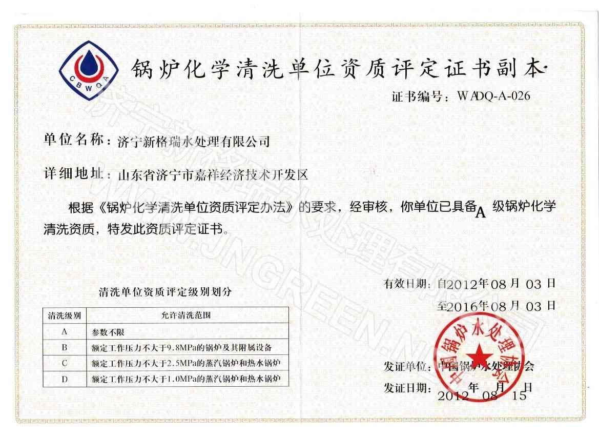 2008年08月,獲中國(guó)鍋爐水處理協(xié)會(huì)鍋爐化學(xué)清洗A級(jí)資質(zhì)。