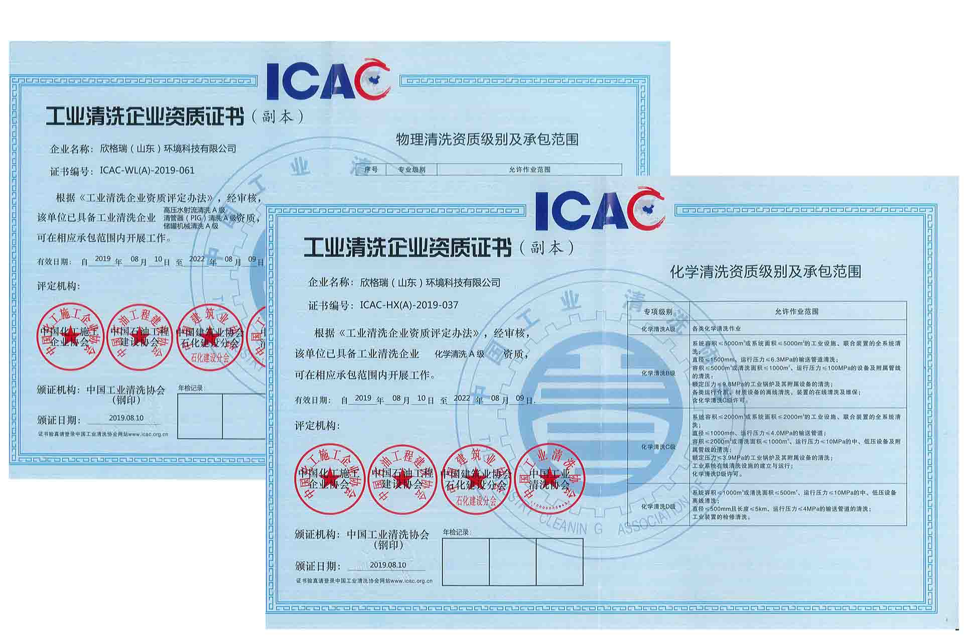 2012年10月,獲中國(guó)工業(yè)清洗協(xié)會(huì)等四協(xié)會(huì)聯(lián)合頒發(fā)的工業(yè)設(shè)備化學(xué)、物理清洗A級(jí)資質(zhì)。