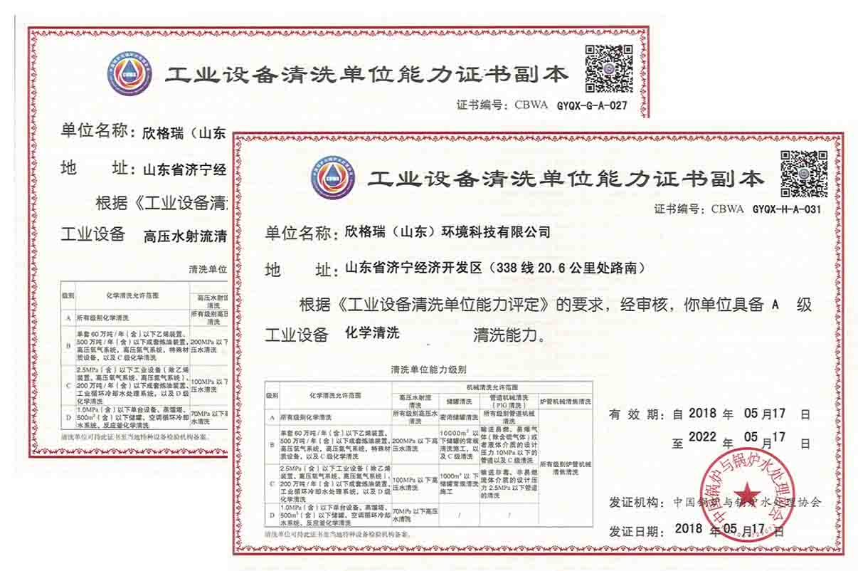 2018年05月,獲中國(guó)鍋爐水處理協(xié)會(huì)工業(yè)設(shè)備化學(xué)、物理清洗A級(jí)資質(zhì)。