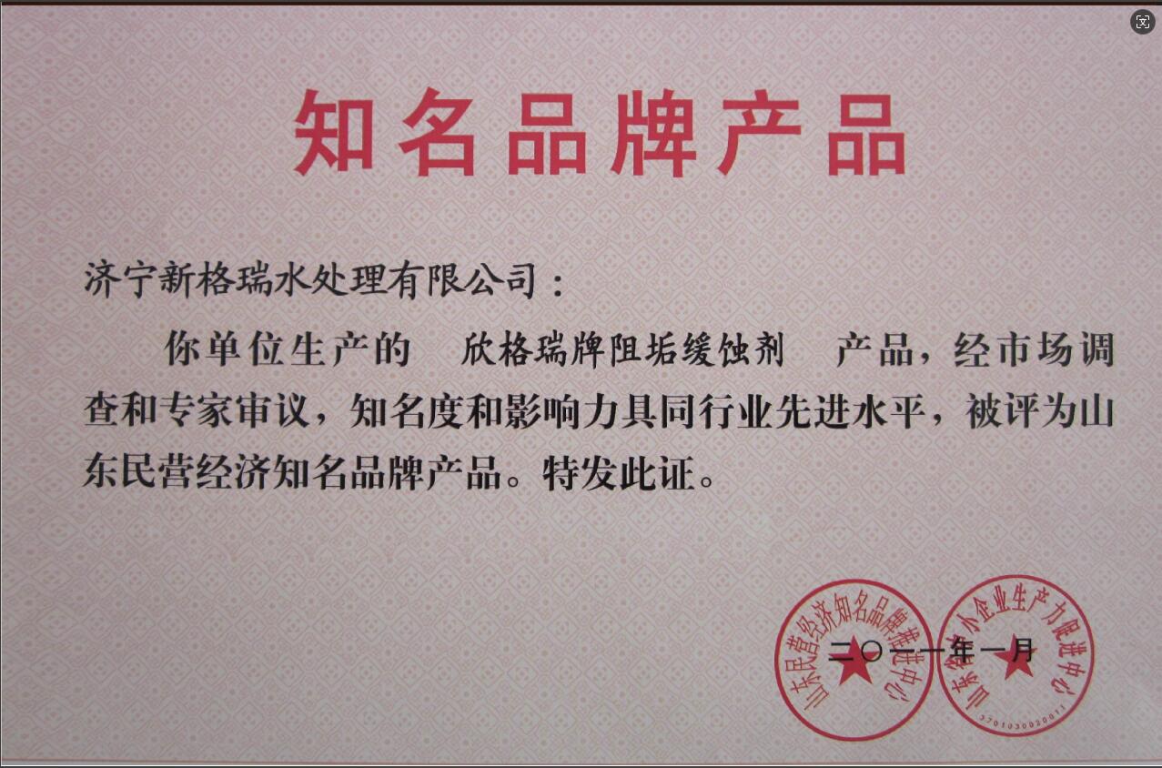 2022年11月,“欣格瑞牌綠色環(huán)保阻垢緩蝕劑”獲評(píng)山東優(yōu)質(zhì)品牌產(chǎn)品。