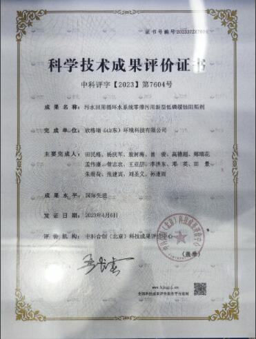 2023年04月,“污水回用循環(huán)水系統(tǒng)零排污用新型低磷緩蝕阻垢劑”成果被評(píng)價(jià)為國(guó)際領(lǐng)先水平。